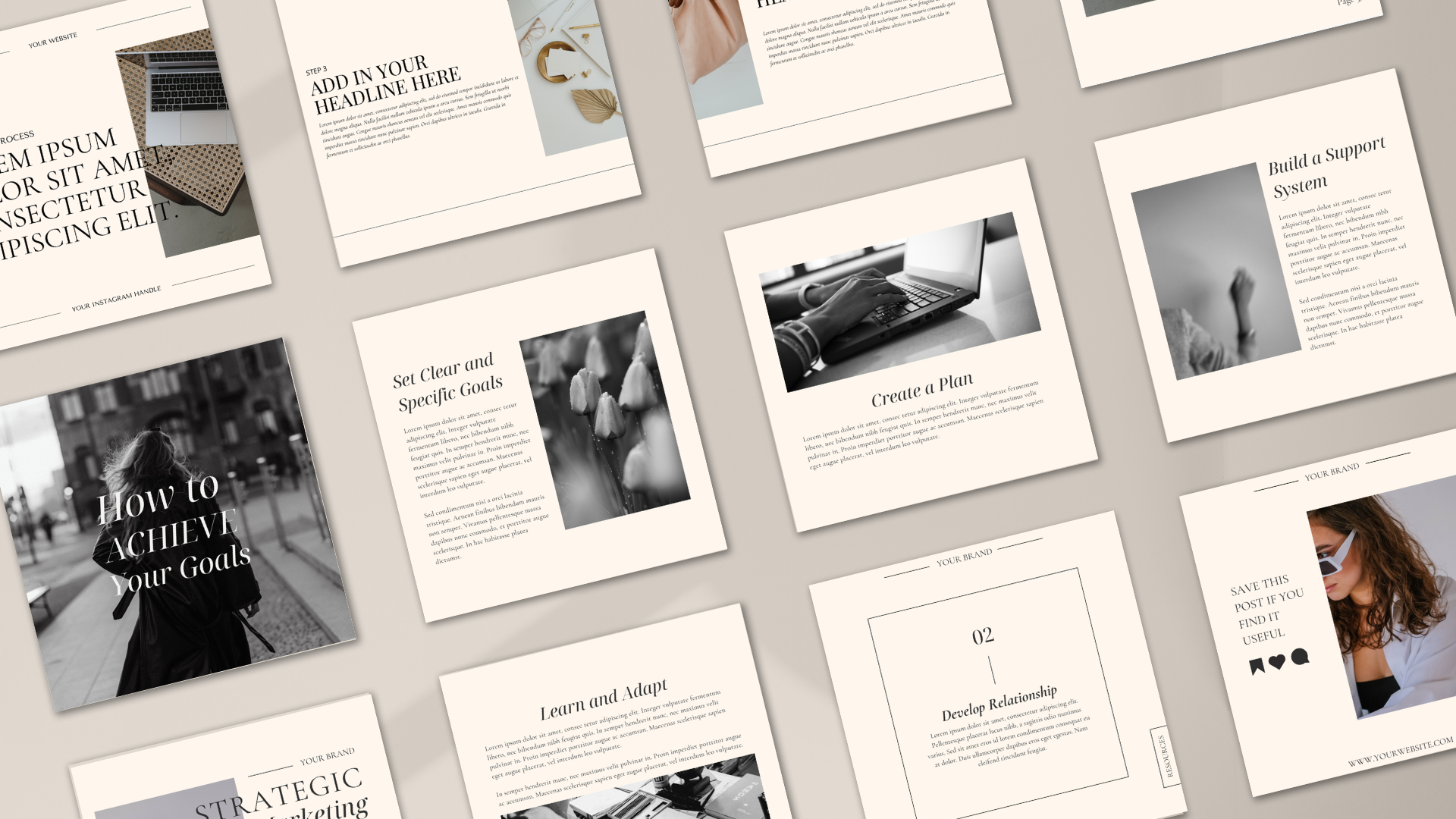 Elevate your Instagram presence with the "Effortless Elegance II" carousel templates. This collection of 5 beautifully designed sets provides a sophisticated and minimalist aesthetic that will seamlessly blend with any brand or niche.