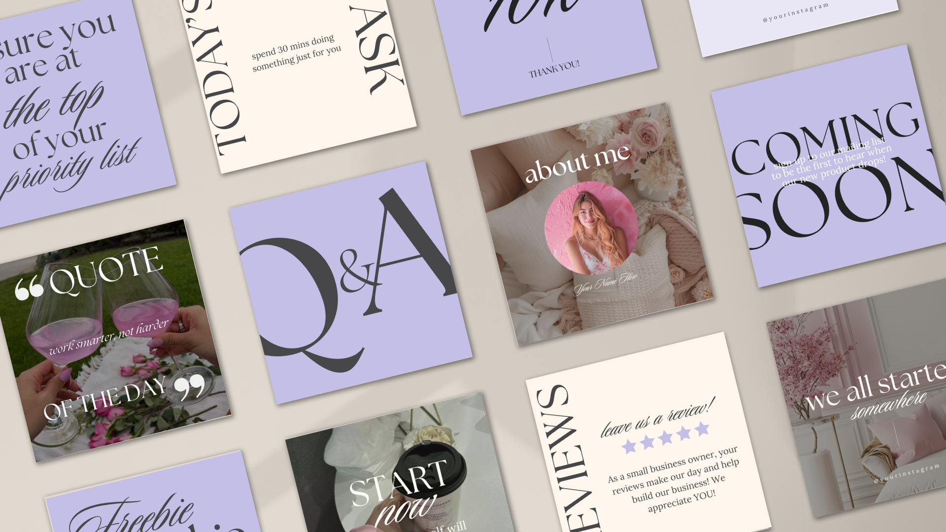 Infuse your Instagram with a touch of floral elegance and feminine charm with the Lavender Luxe. This collection of 35 Instagram post and 35 story templates features a beautiful blend of purple hues, delicate floral accents, and minimalist layouts, creating a captivating and sophisticated aesthetic.